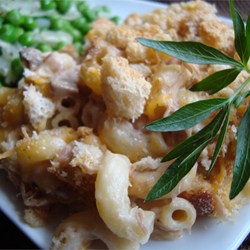 A classic casserole is enriched with a whole pound of cheese added to a familiar mix of tuna, macaroni and cream of mushroom soup. Top with scrumptious cheese-and-garlic-flavored croutons and bake until bubbly.